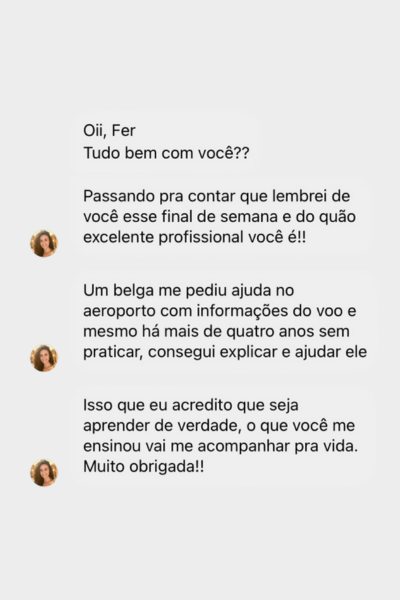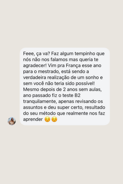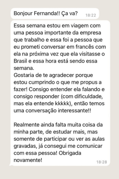 Com meu acompanhamento próximo, você supera bloqueios, perde o medo de errar e se comunica em francês desde as primeiras aulas.